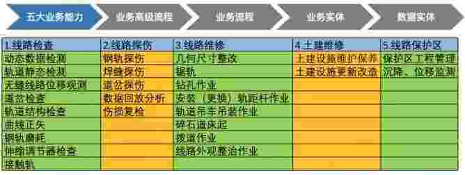在轨道运维业务中,,,,,,,,,我们形成了完整的从业务能力(业务域)-业务流程-业务实体-数据模型的分析梳理过程。。。。。。。。。。轨道运维业务能力如下图所示::::::::::