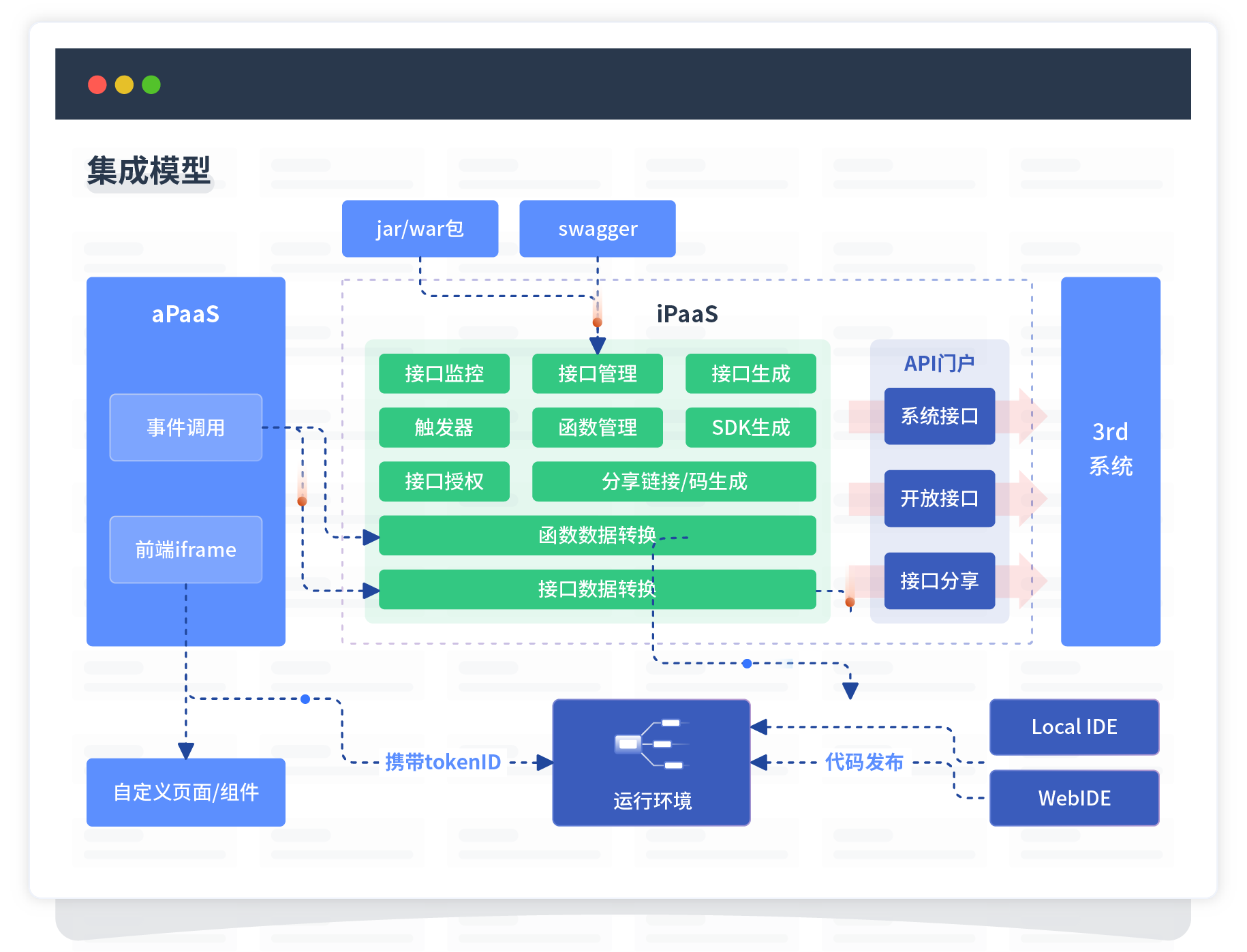 集成模型包括平台本身前、、、、、、、后端能力的扩展,,,,,,,,也支持通过API门户和第三方系统进行交互。。。。