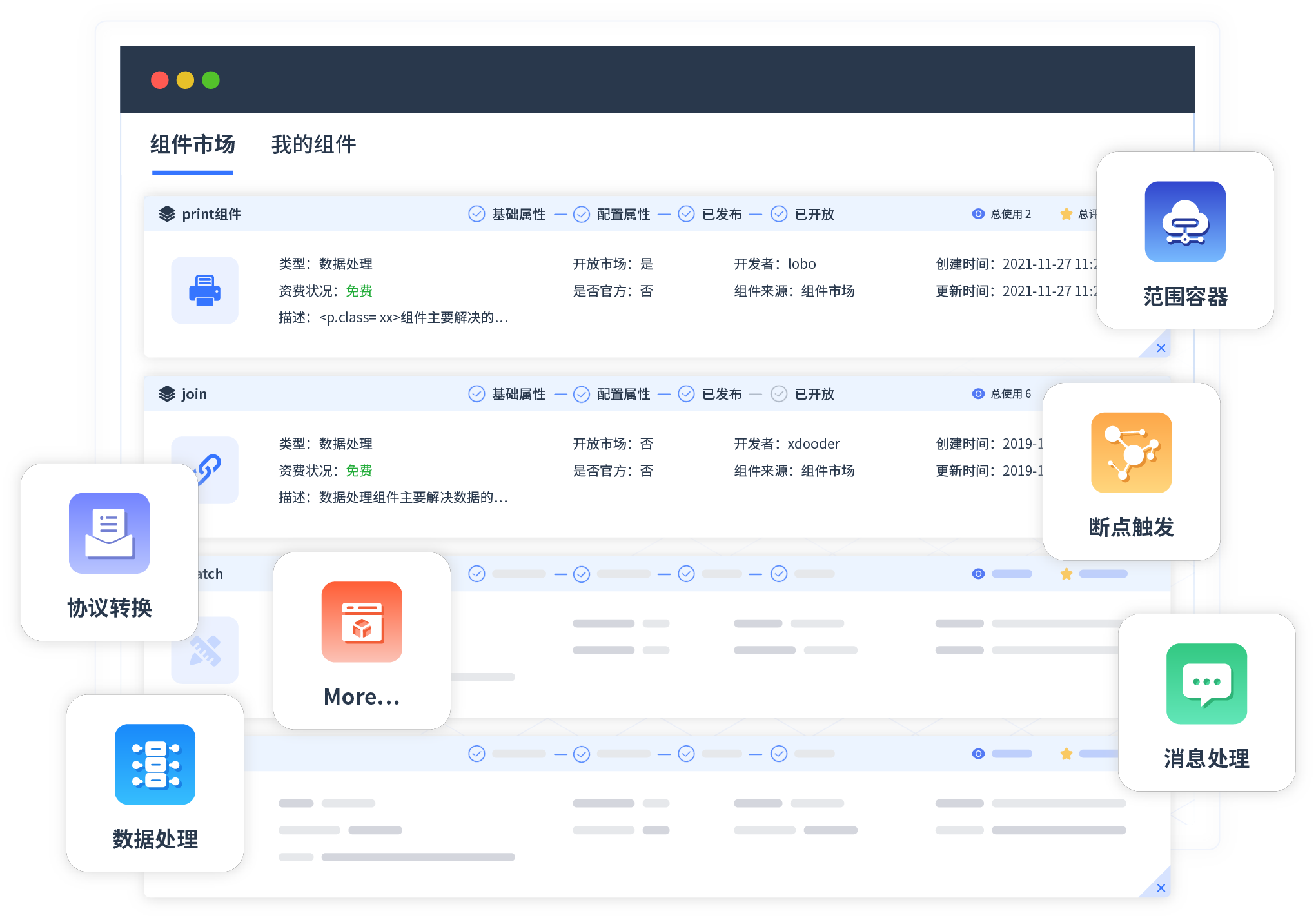 针对集成场景,,,,,,,小米钱包提供组件市场,,,,,,,,,,,,,例如协议转换、、、、、、、、、消息处理、、、、、、、、、、、、、文件操作等。。。。。。。。。。除平台提供的组件外,,,,,,,,,客户可以自定义所需组件。。。。。。。。。。。